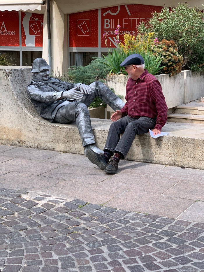 Nearby the merry-go-round we came across this really clever sculpture. Chuck said “Oh, let me sit next to him and you can take my picture.”